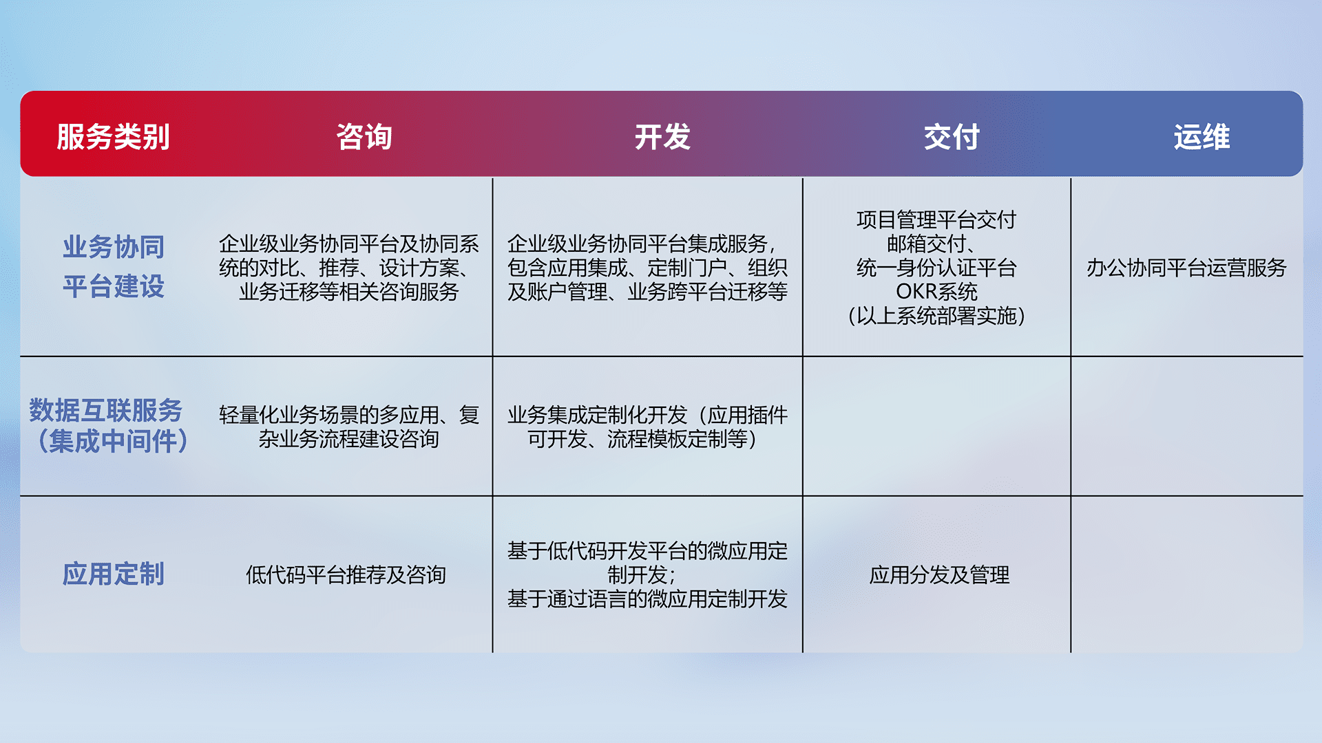 针对钉钉、、、、企微、、IDaas等平台级产品提供产品的规划、、、、方案、、、、交付、、定制化开发等服务,,实现如统一协同办公、、、、智能客户服务、、、混合会议管理、、、、智能数据查询、、等业务场景,,,,实现数字化转型。。